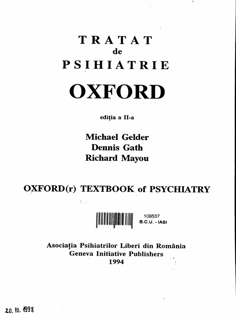 1994 Tratat de psihiatrie Oxford editat de Asocia t ia Psihiatrilor Liberi Geneva Initiative on Psychiatry. A militarului se. La Editura Fundatiei Andrei Saguna a.